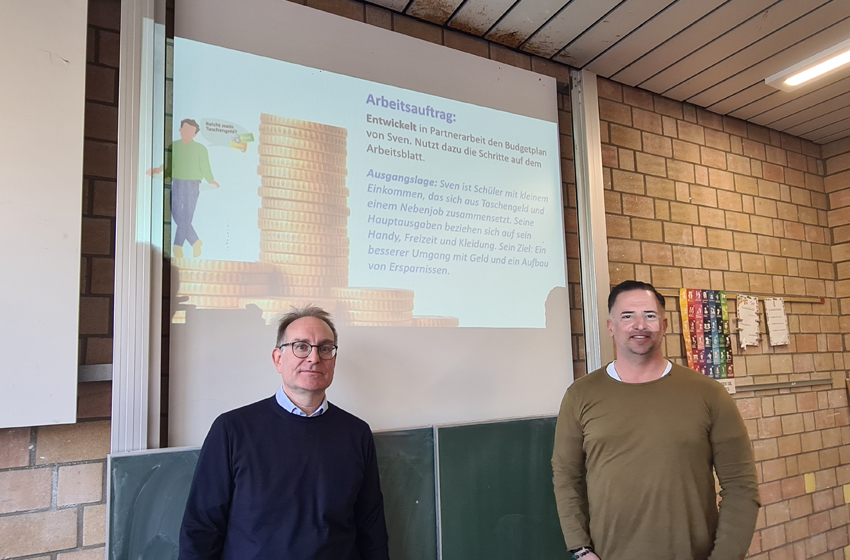 Dirk Langer und Thomas Razeng, Mitarbeiter der Bank Consors Finanz, BNP Paribas, gaben zunächst Einblicke in ihren beruflichen Alltag und zeigten, wie wichtig finanzielle Planung im Berufs- und Privatleben ist.